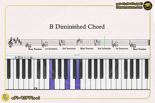 - تقارن: آکورد کاهش یافته هفتم متقارن است، به این معنی که فواصل بین نتها یکسان است. این ویژگی باعث میشود که آکورد کاهش یافته هفتم، چهار نت پایه (Root) بالقوه داشته باشد.