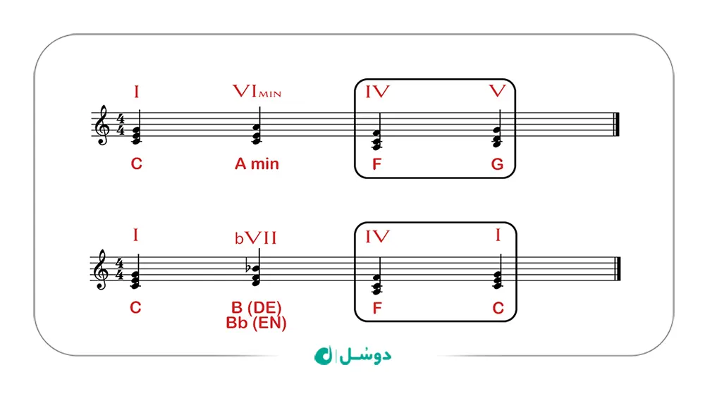 • جایگزینی آکورد V با V7: استفاده از آکورد V7 به جای V می‌تواند از قدرت کادانس بکاهد.