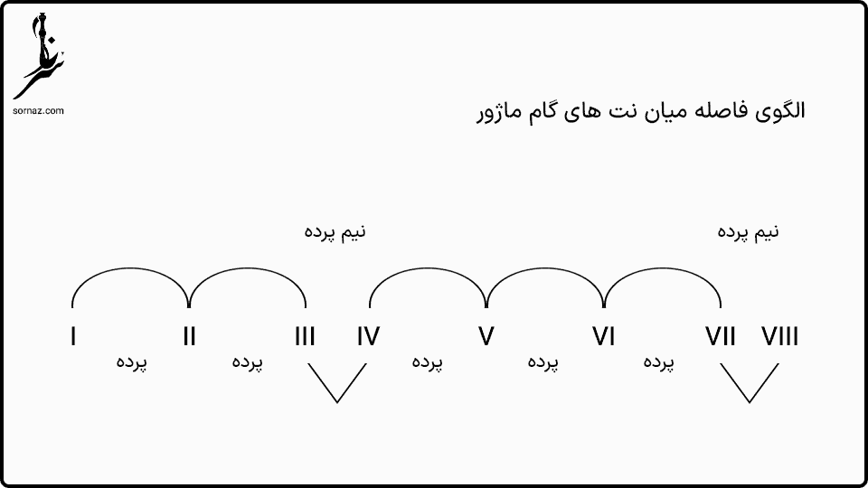 همانطور که اشاره شد، فواصل در گام ماژور از الگوی «پرده – پرده – نیم پرده – پرده – پرده – پرده – نیم پرده» پیروی میکنند. به عبارت دیگر: